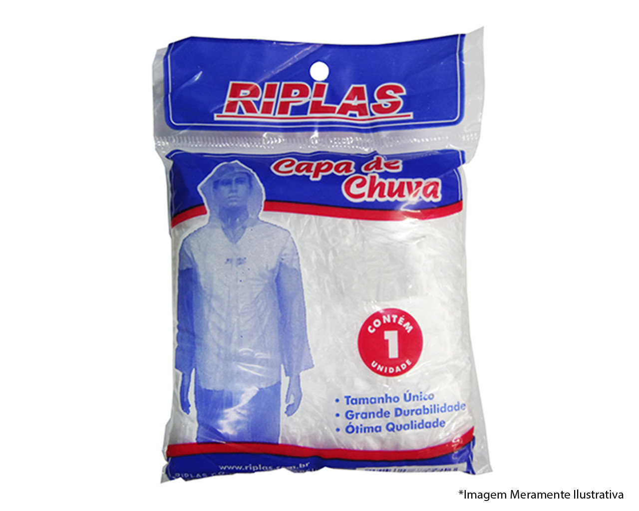 Capa de chuva descartável com capuz e manga; Comprimento: 1,20m; Largura: 0,80m; 3 micras.